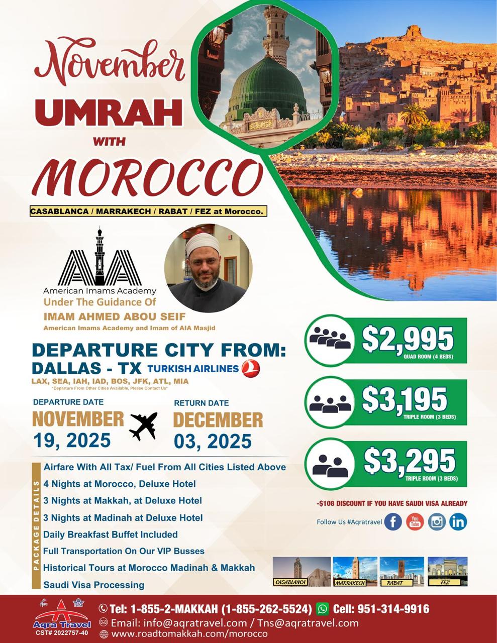 Join American Imams Academy under the guidance of Imam Ahmed Abou Seif for an unforgettable Umrah and Morocco experience.